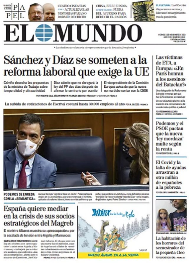 EL MUNDO: "Sánchez y Díaz se someten a la reforma laboral que exige la UE"; "España quiere mediar en la crisis de sus socios estratégicos del Magreb"; "Las víctimas de ERA, a Europa: "¿En París honran a los asesinos del Bataclan?""; "Podemos y el PSOE pactan que la nueva 'ley mordaza' multe según la renta"; "El Covid y la falta de ayudas arrastran a otro millón de españoles a la pobreza"; "La habilitación de los horrores del secuestrador de la pequeña Cleo".