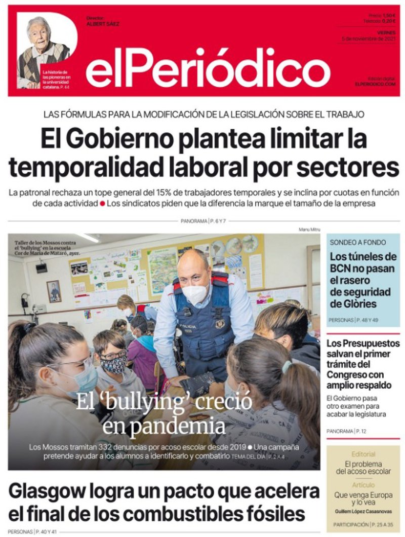EL PERIÓDICO: "El Gobierno plantea limitar la temporalidad laboral por sectores"; "El 'bullying' creció en pandemia"; "Glasgow logra un pacto que se acelera el final de los combustibles fósiles"; "Los túneles de BCN no pasan el rasero de seguridad de Glòries"; "Los Presupuestos salvan el primer trámite del Congreso con amplio respaldo".