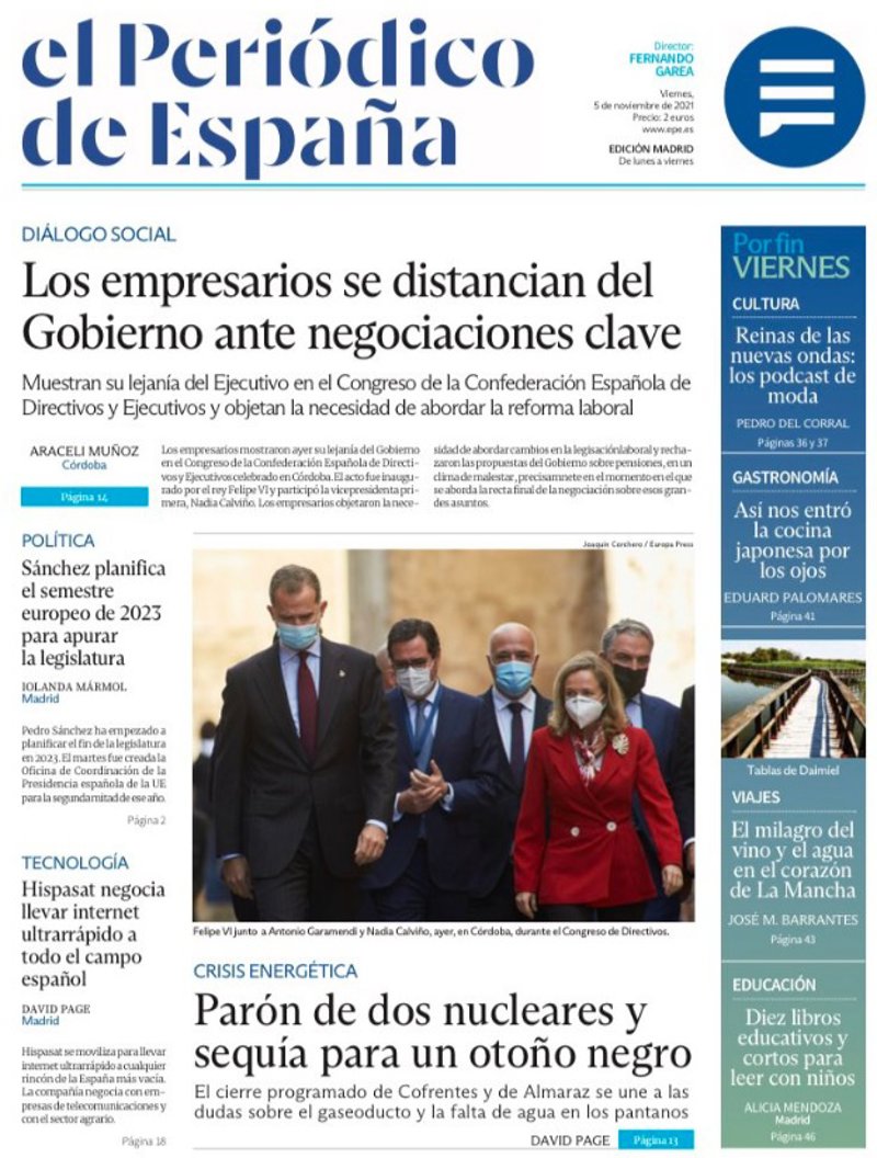 EL PERIÓDICO DE ESPAÑA: "Los empresarios se distancian del Gobierno ante negociaciones clave"; "Sánchez planifica el semestre europeo de 2023 para apurar la legislatura"; "Hispasat negocia llevar internet ultrarrápido a todo el campo español"; "Parón de dos nucleares y sequía para un otoño negro".