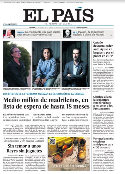 EL PAÍS: "Medio millón de madrileños, en lista de espera de hasta 18 meses"; "Casado descarta ceder ante Ayuso en la guerra por el poder en el PP"; "Sánchez allana la legislatura con el rechazo a los vetos a los Presupuestos"; "Sin temor a unos Reyes sin juguetes"; "Portugal anuncia elecciones anticipadas para el 30 de enero"; "La cooperante que pasó cuatro años secuestrada vuelve a Malí"; "Picasso, de inmigrante