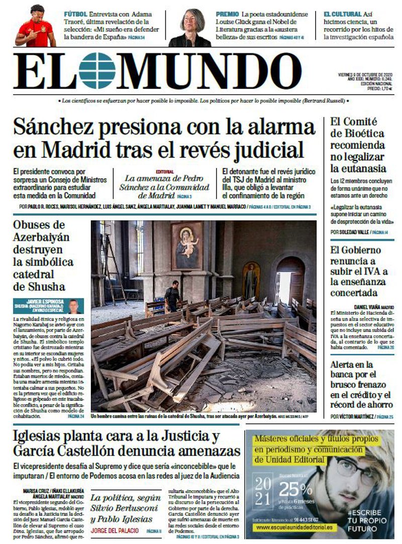EL MUNDO: "Sánchez presiona con la alarma en Madrid tras el revés judicial"; "Obuses de Azerbaiyán destruyen la simbólica catedral de Shusha"; "Iglesias planta cara a la Justicia y García Castellón denuncia amenazas"; "El Comité de Bioética recomienda no legalizar la eutanasia"; "El Gobierno renuncia a subir el IVA a la enseñanza concertada"; "Alerta en la banca por el brusco frenazo en el crédito y el récord de ahorro".
