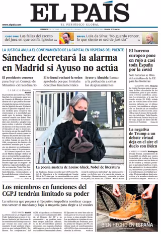 EL PAÍS: "Sánchez decretará la alarma en Madrid si Ayuso no actúa"; "Los miembros en funciones del CGPJ tendrán limitado su poder"; "El baremo europeo pone en rojo a casi toda España por la covid"; "La negativa de Trump a un debate virtual deja en el aire el duelo con Biden".