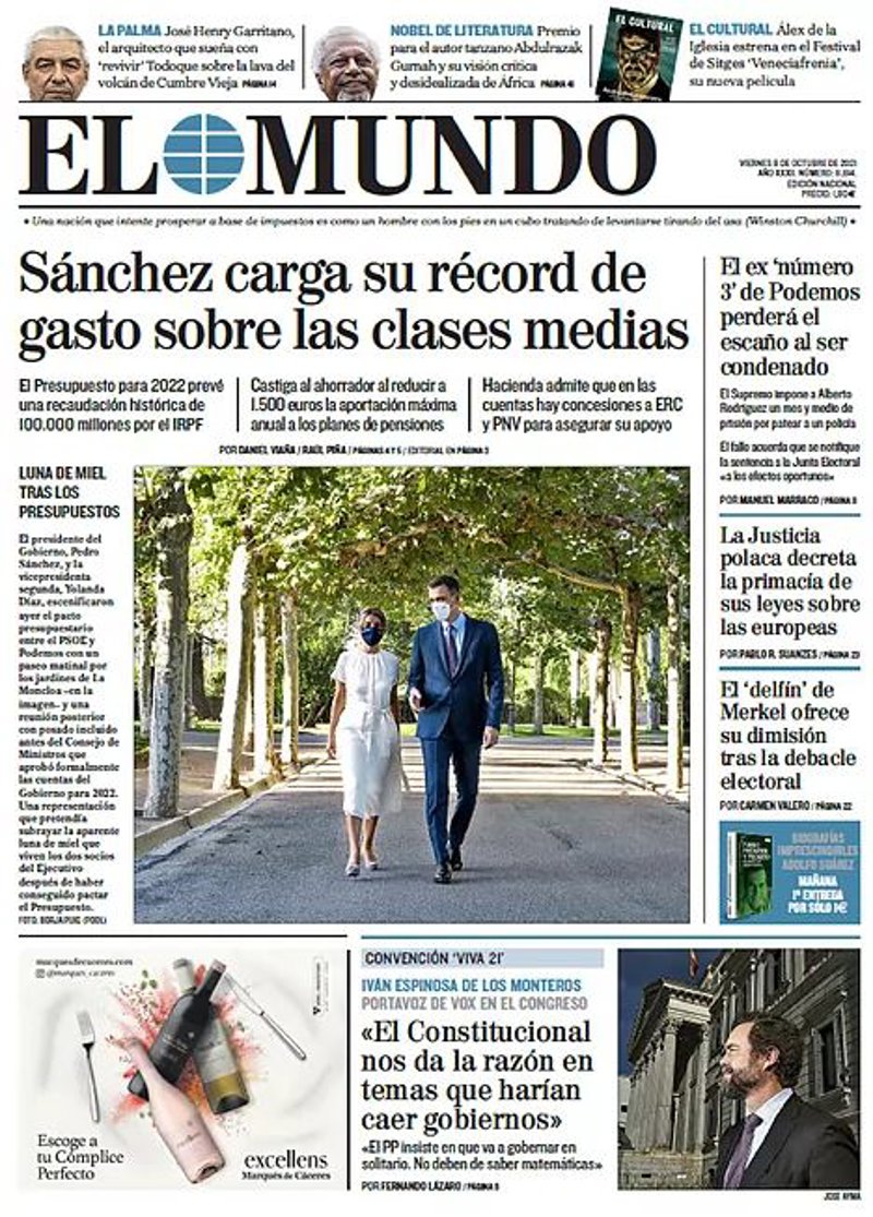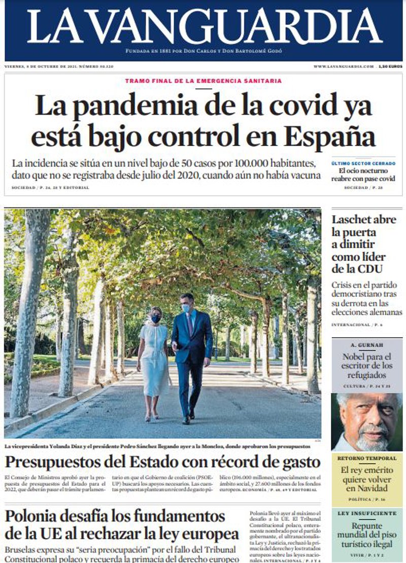 EL PAÍS: "Sánchez lanza las últimas cuentas expansivas antes del ajuste poscovid"; "España entra en riesgo bajo de covid por primera vez en más de un año"; "Las peligrosas expediciones de un geólogo en La Palma: "Se abrió una boca del volcán bajo mis pies""; "Abdulrazak Gurnah, Nobel de literatura para un desconocido"; "Polonia entra en un choque frontal con la UE al desafiar a su justicia"; "Armin Laschet, dispuesto a apartarse del liderazgo de la CDU"; "Rusia se aprovecha de la crisis energética para presionar a Europa".