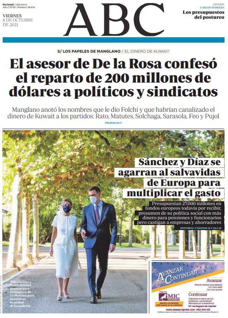 ABC: "El asesor de De la Rosa confesó el reparto de 200 millones de dólares a políticos y sindicatos. Manglano anotó los nombres que le dio Folchi y que habrían canalizado el dinero de Kuwait a los partidos: Rato, Matutes, Solchaga, Sarasola, Feo y Pujol"; "Sánchez y Díaz se agarran al salvavidas de Europa para multiplicar el gasto. Presupuestan 27.000 millones en fondos europeos todavía por recibir, presumen de su política social con más dinero para pensiones y funcionarios pero castigan a empresas y ahorradores".