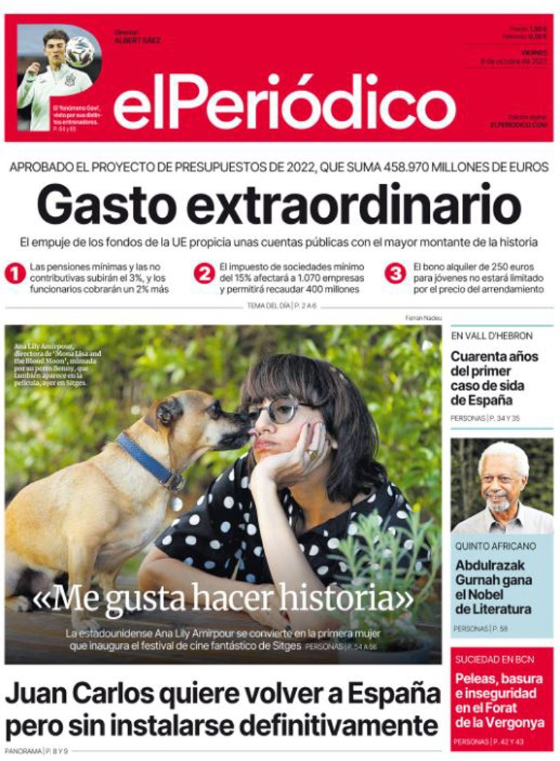 EL PERIÓDICO: "Gasto extraordinario. El empuje de los fondos de la UE propicia unas cuentas públicas con el mayor montante de la historia"; "Juan Carlos quiere volver a España pero sin instalarse definitivamente"; "Cuarenta años del primer caso de sida de España"; "Abdulrazak Gurnah gana el Novel de Literatura"; "Peleas, basura e inseguridad en el Forat de la Vergonya".