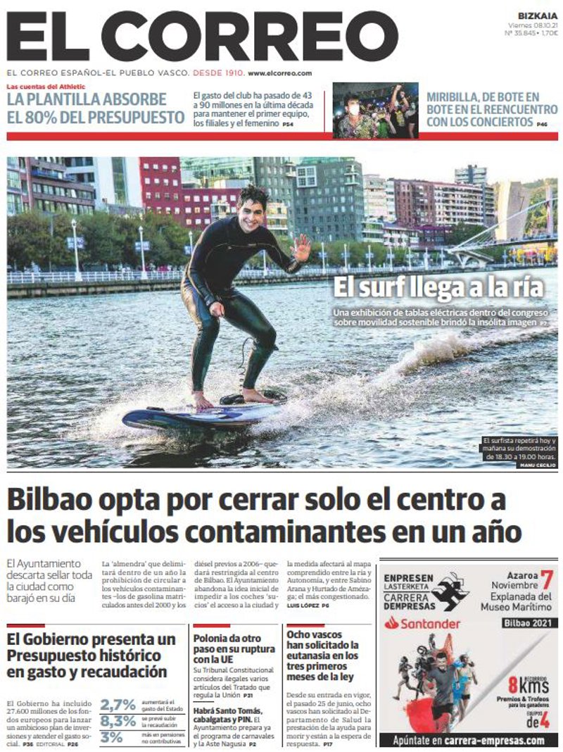 EL CORREO: "Bilbao opta por cerrar solo el centro a los vehículos contaminantes en un año"; "El Gobierno presenta un Presupuesto histórico en gasto y recaudación"; "Ocho vascos han solicitado la eutanasia en los tres primeros meses de la ley"; "Polonia da otro paso en su ruptura con la UE"; "Habrá Santo Tomás, cabalgatas y PIN. El Ayuntamiento prepara ya el programa de carnavales y la Aste Nagusia".