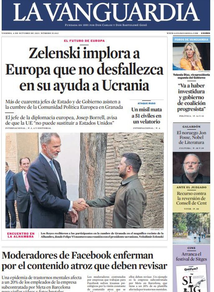 LA VANGUARDIA: "Zelenski implora a Europa que no desfallezca en su ayuda a Ucrania"; "Moderadores de Facebook enferman por el contenido atroz que deben revisar"; "Yolanda Díaz: "Va a haber investidura y gobierno de coalición progresista"".