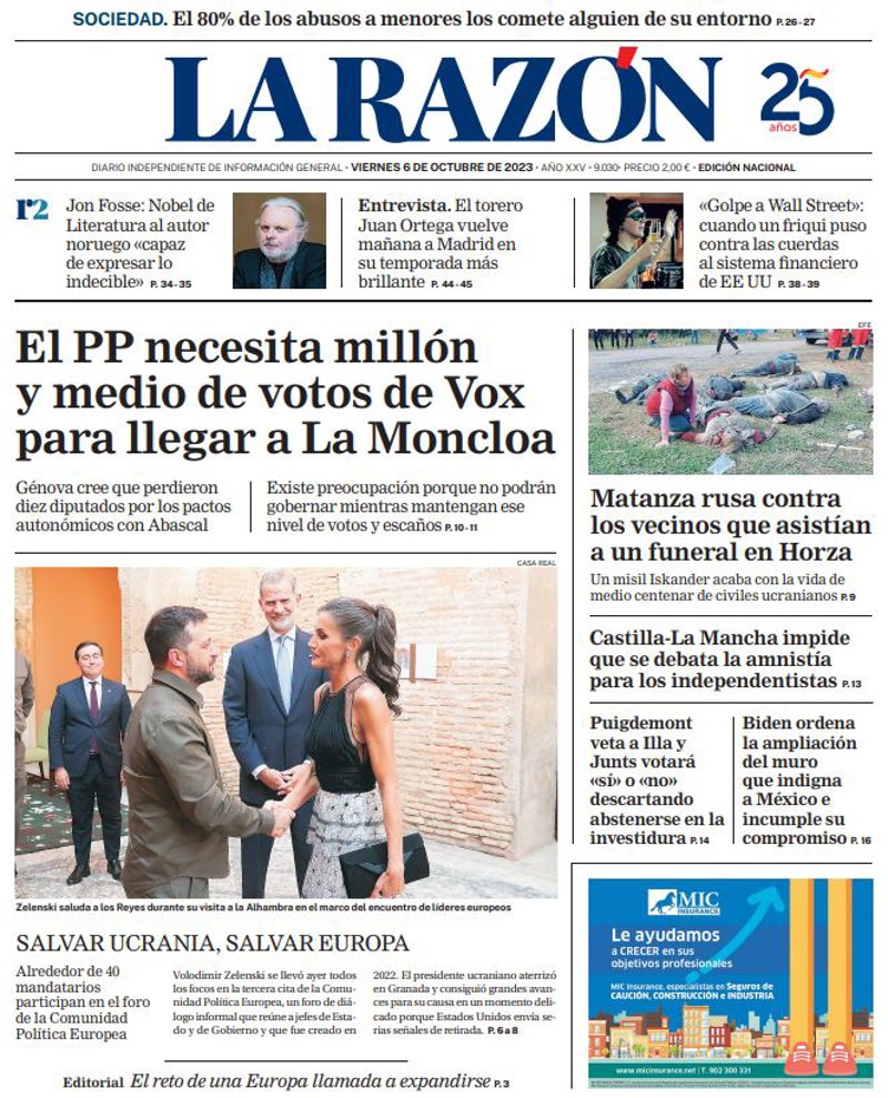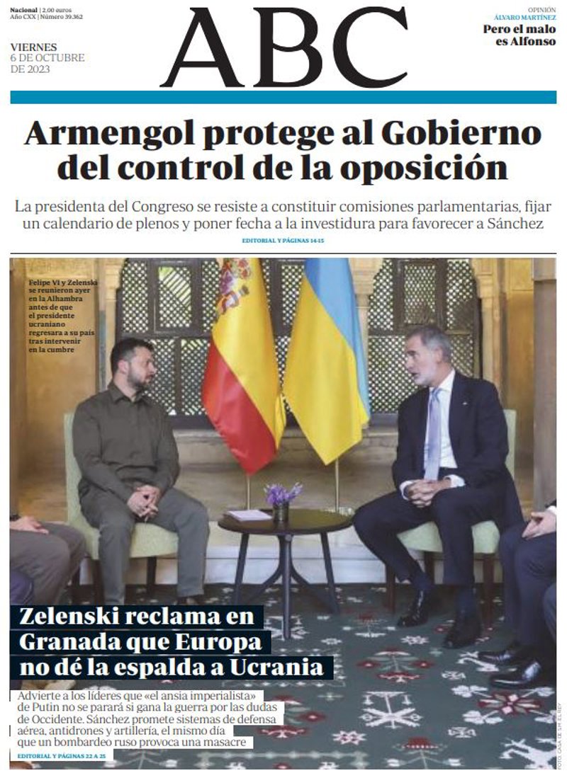 ABC: "Armengol protege al Gobierno del control de la oposición. La presidenta del Congreso se resiste a constituir comisiones parlamentarias, fijar un calendario de plenos y poner fecha a la investidura para favorecer a Sánchez"; "Zelenski reclama en Granada que Europa no dé la espalda a Ucrania. Advierte a los líderes que "el ansia imperialista" de Putin no se parará si gana la guerra por las dudas de Occidente. Sánchez promete sistemas de defensa aérea, antidrones y artillería, el mismo día que un bombardeo ruso provoca una masacre".