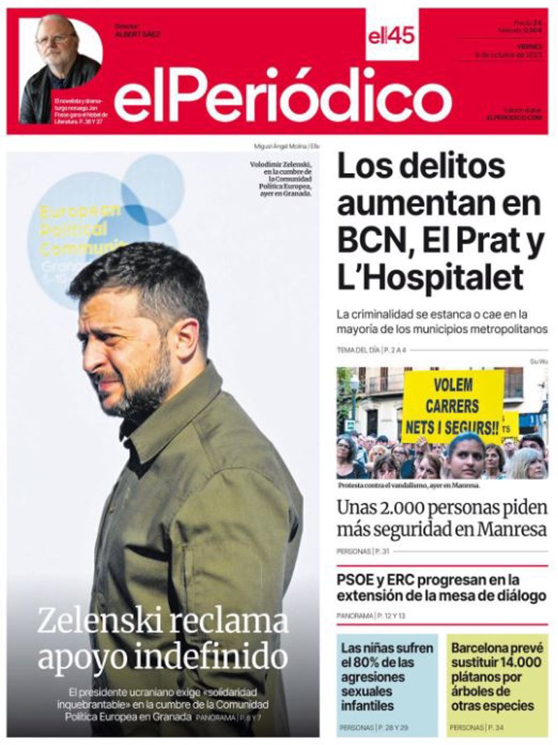 EL PERIÓDICO: "Zelenski reclama apoyo indefinido"; "Los delitos aumentan en BCN, El Prat y L'Hospitalet"; "Unas 2.000 personas piden más seguridad en Manresa"; "PSOE y ERC progresan en la extensión de la mesa de diálogo"; "Las niñas sufren el 80% de las agresiones sexuales infantiles"; "Barcelona prevé sustituir 14.000 plátanos por árboles de otras especies".