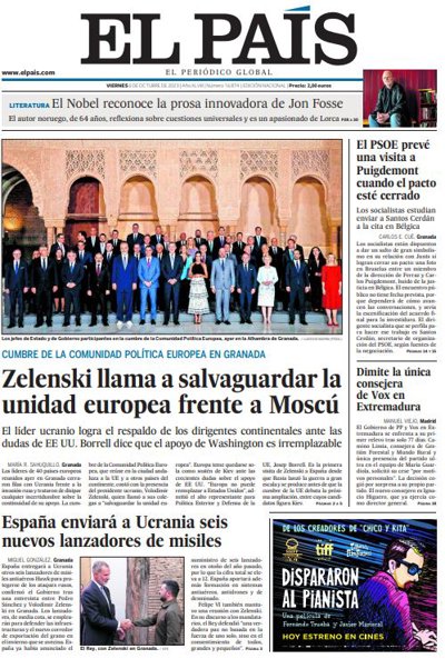 EL PAÍS: "Zelenski llama a salvaguardar la unidad europea frente a Moscú"; "España enviará a Ucrania seis nuevos lanzadores de misiles"; "El PSOE prevé una visita a Puigdemont cuando el pacto esté cerrado"; "Dimite la única consejera de Vox en Extremadura".