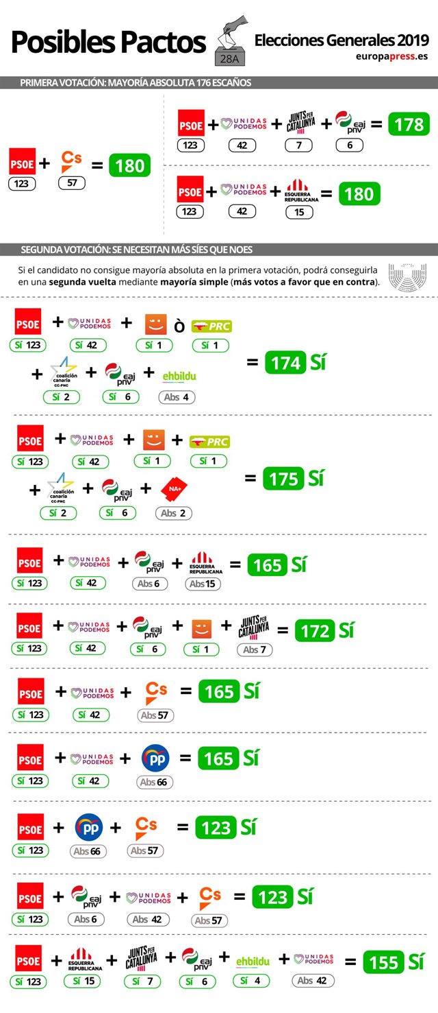 También tendría la opción de obtener el apoyo de Unidas Podemos y su aliado catalán de En Comú, que suman 42 diputados. Juntos, los socialistas y los de Pablo Iglesias darían a Pedro Sánchez 165 votos a favor. Para ser investido en primera vuelta, necesitaría también el apoyo de ERC (15 escaños) o al menos de PNV (6 escaños) y JxCat (7 escaños).