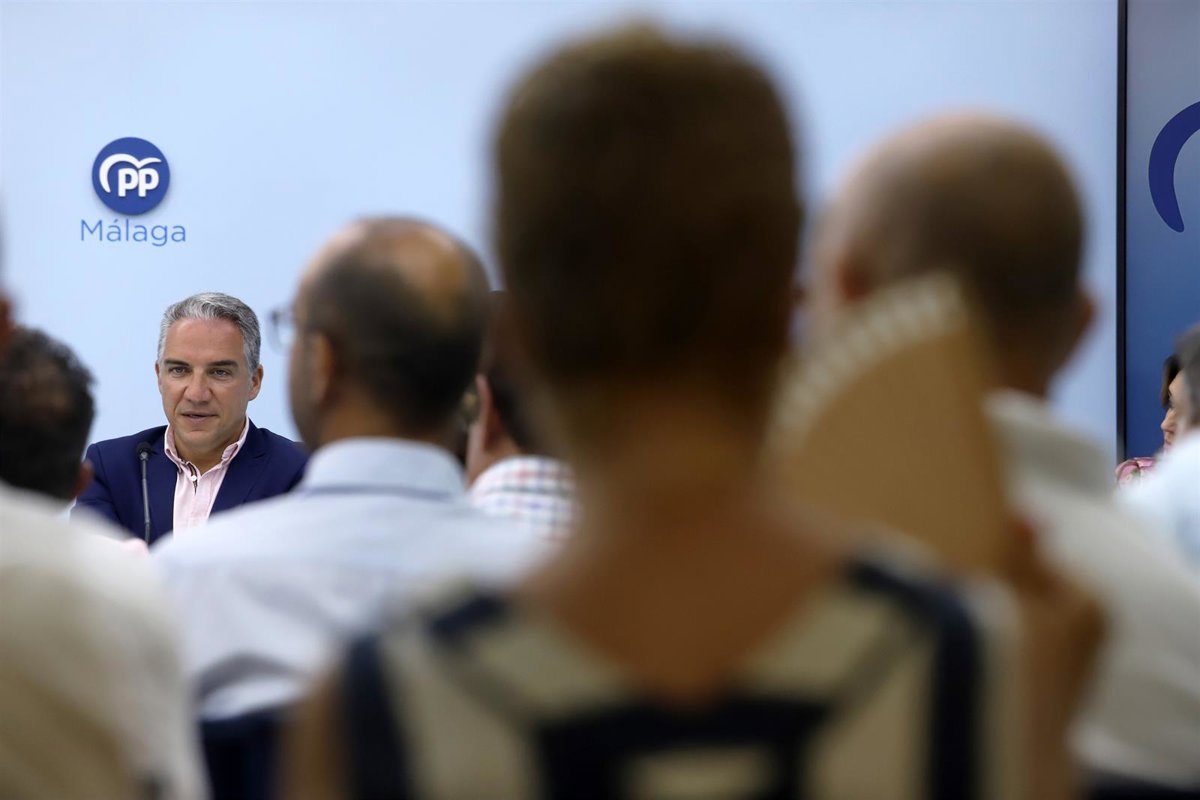 El coordinador general del PP, presidente provincial y parlamentario andaluz, Elías Bendodo, en rueda de prensa tras mantener una reunión con alcaldes y portavoces municipales a 2 de agosto de 2022 en Málaga, Andalucía. - EUROPA PRESS/ÁLEX ZEA