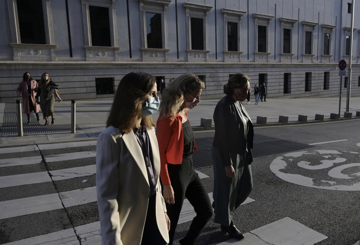 (I-D) La ministra de Derechos Sociales y Agenda 2030, Ione Belarra; la vicepresidenta segunda y ministra de Trabajo y Economía Social, Yolanda Díaz; y la alcaldesa de Barcelona, Ada Colau. - Óscar Cañas - Europa Press
