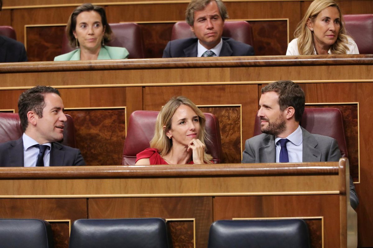(i-d) El secretario general del PP Teodoro García Egea, la portavoz del PP en el Congreso Cayetana Álvarez de Toledo y el presidente del PP Pablo Casado durante el Pleno extraordinario en el Congreso para tratar la gestión del 'Open Arms'. - Jesús Hellín - Europa Press