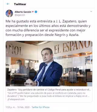 Así, desde la cuenta oficial del Partido Popular en Twitter se han hecho eco de un mensaje publicado por Garzón elogiando a Zapatero como "el expresidente con mejor formación y preparación" desde los republicanos Juan Negrín y Manuel Azaña. "Con mucha diferencia", ha escrito el ministro a cuenta de una entrevista del expresidene socialista en El Español.