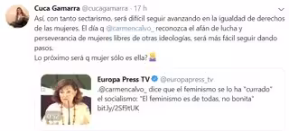 En parecidos términos se ha expresado la exministra de Sanidad y actual eurodiputada Dolors Montserrat, que ha asegurado que Calvo "utilizaba la manifestación del 8M para cargar contra el PP entre saltitos y gritos". "Vienen a dar lecciones de feminismo los que mandaron a miles de mujeres al paro. Inaudito", ha resaltado en un mensaje en su cuenta oficial de Twitter, que ha recogido Europa Press.