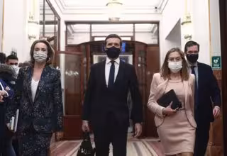 (I-D) La portavoz parlamentaria del PP, Cuca Gamarra, el presidente del PP, Pablo Casado y vicesecretaria de Política Social del PP, Ana Pastor llegan a una sesión plenaria en el Congreso de los Diputados, en Madrid (España), a 16 de diciembre de 2020. - EUROPA PRESS/E. Parra. POOL - Europa Press