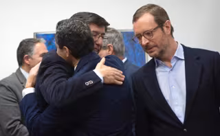 Juanma Moreno y Juan Marín se abrazan al inicio de la reunión PP-Cs - PP-A
