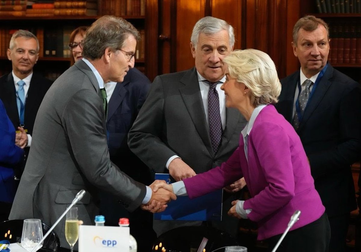El líder del PP, Alberto Núñez Feijóo, saluda a la presidenta de la Comisión Europea, Ursula von der Leyen, en la reunión del PPE en Bruselas. - TAREK (PP)