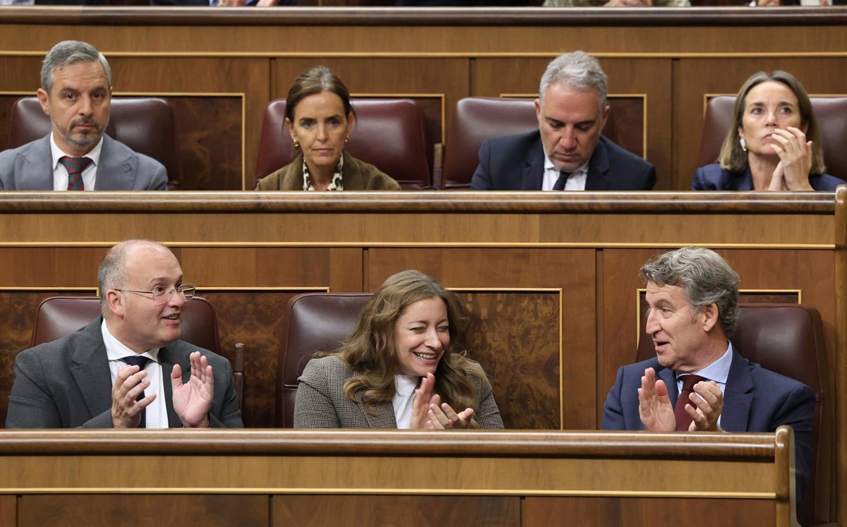 El secretario general del PP, Miguel Tellado; la portavoz del PP en el Congreso, Ester Muñoz, y el presidente del Partido Popular, Alberto Núñez Feijóo, durante una sesión plenaria, en el Congreso, a 16 de octubre de 2025, en Madrid (España). - Marta Fernández - Europa Press