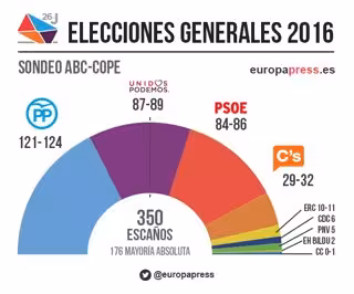 El PP ganará las elecciones generales de este domingo con un 30,4 por ciento de los votos y entre 121 y 124 escaños y Podemos será segundo en votos y escaños, con un 24,8 por ciento de los sufragios y entre 87 y 89 escaños, según el sondeo de GAD3 para ABC y Cadena COPE.