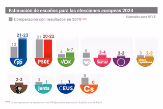 El Partido Popular es el ganador de las elecciones europeas celebradas en el día de hoy en España, obteniendo el 32,4 por ciento de los votos y entre 21 y 23 escaños. Por su parte, el PSOE se situaría con el 30,2 por ciento de los votos, a 2,2 puntos de los populares, con entre 20 y 22 escaños, según el sondeo de Sigma 2 para RTVE y la Forta.