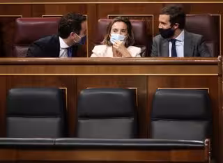 (I-D) Los diputados del PP Teodoro García Egea, Cuca Gamarra y Pablo Casado charlan en sus escaños durante una sesión plenaria en el Congreso de los Diputados, en Madrid (España), a 10 de septiembre de 2020. En el pleno de hoy, el Congreso debate, entre - EUROPA PRESS/E. Parra. POOL - Europa Press