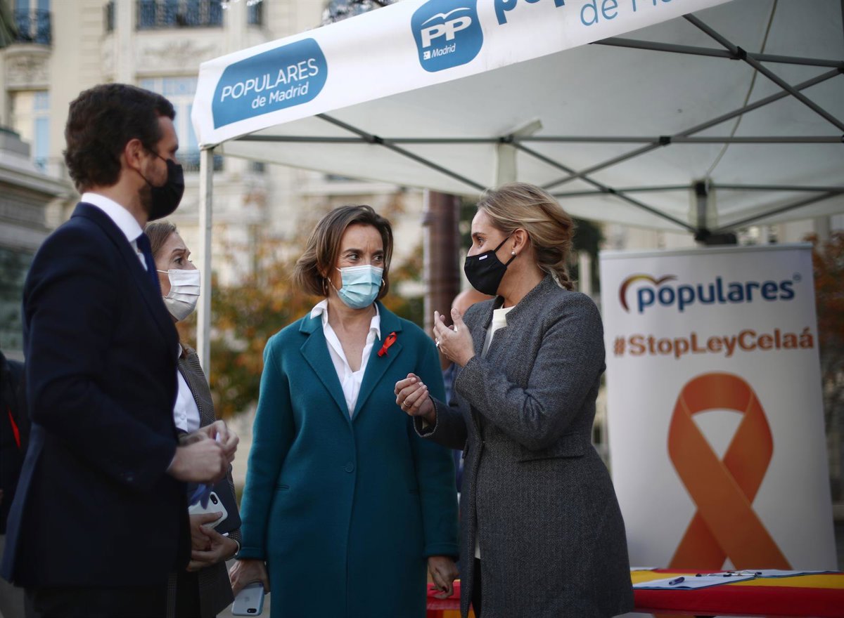 El presidente del Partido Popular, Pablo Casado, junto a Cuca Gamarra y Ana Camins, en la recogida de firmas del PP contra la Ley Celaá, en las inmediaciones del Congreso. En Madird, a 19 de noviembre de 2020. - Eduardo Parra - Europa Press