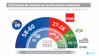Traducido en escaños, este resultado arrojaría entre 58 y 60 escaños para el PP-A en el Parlamento andaluz, frente a los 58 que tiene en la actualidad, mientras que el PSOE-A bajaría a 27 o 28 respecto a sus actuales 30.