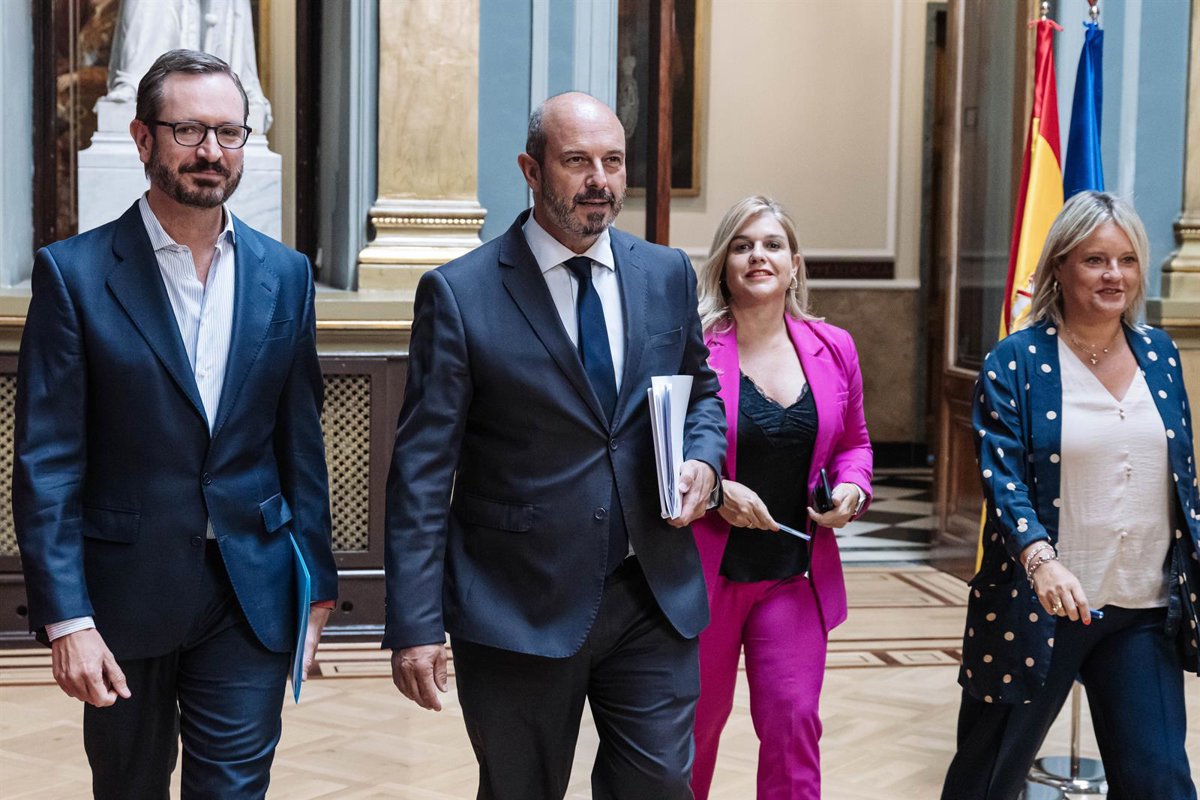 (I-D) El vicepresidente primero de la Mesa del Senado, Javier Maroto; el presidente del Senado, Pedro Rollán; la secretaria primera de la Mesa del Senado, Eva Ortiz y la secretaria segunda, María Mar Blanco, a su llegada a una reunión de la Mesa del Sen - Carlos Luján - Europa Press