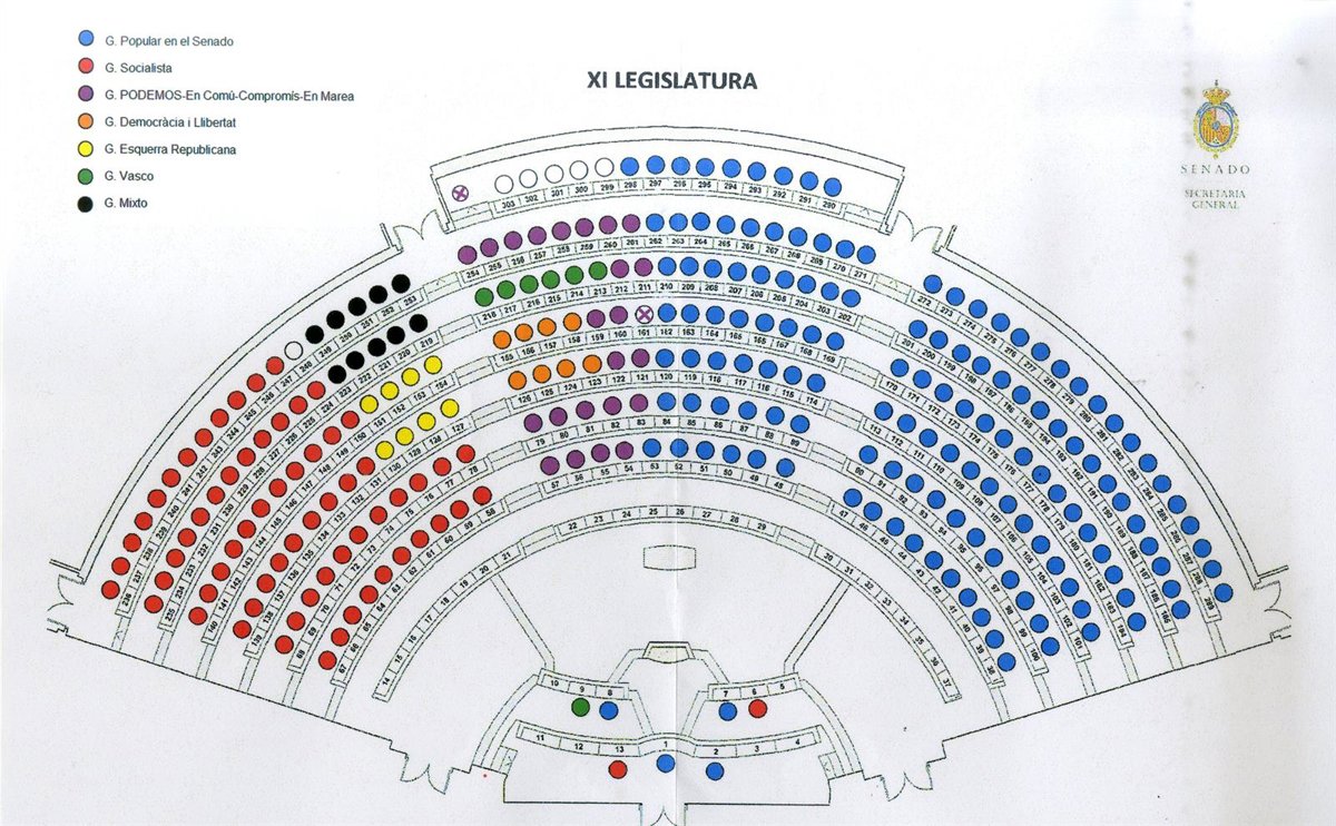 El PP sentará a sus 143 senadores como viene haciéndolo en los últimos años: ocupará el tercio derecho de escaños y la mitad del tercio central. Aquí, Podemos tendrá para sus 23 senadores cuatro escaños en la primera fila y cinco en la segunda. En las filas tercera, cuarta y quinta, sentará sólo a dos, y volverá a tener ocho en la última.