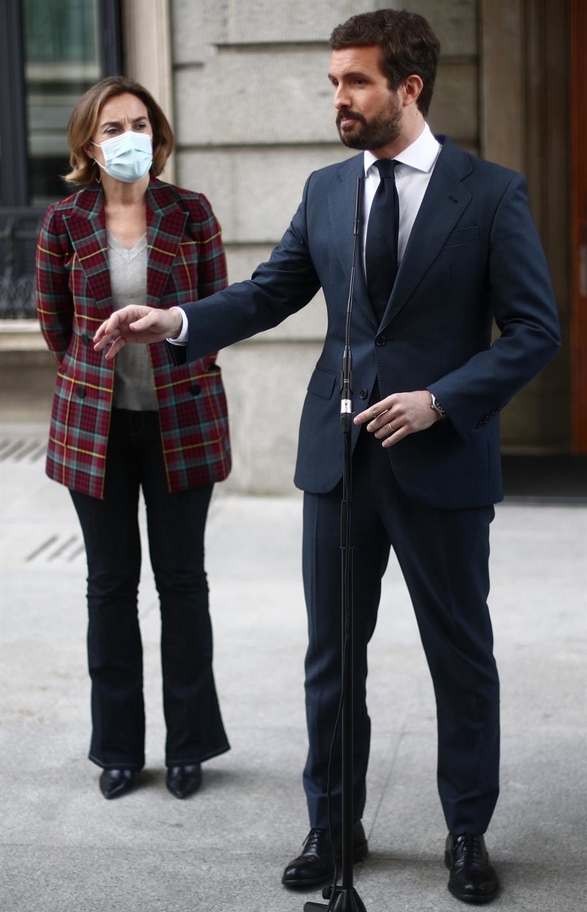 El líder del PP, Pablo Casado, interviene en una rueda de prensa al mismo tiempo que se celebra una sesión de control al Gobierno Central, a 21 de abril de 2021, en el Congreso de los Diputados, Madrid, (España). - EUROPA PRESS/E. Parra. POOL - Europa Press