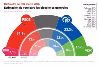 El Barómetro de opinión del Centro de Investigaciones Sociológicas (CIS) correspondiente al mes de marzo, dado a conocer este miércoles, coloca de nuevo al PSOE en cabeza con una estimación de voto del 31,8%, pero los socialistas pierden ocho décimas en un mes y ven reducida en un punto su ventaja sobre el PP, ahora fijada en 8,5 puntos.