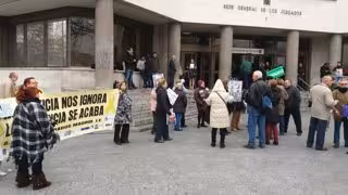 Un grupo de preferentistas protesta desde antes de las nueve de la mañana en la puerta central de los Juzgados de Plaza de Castilla coincidiendo con la declaración en calidad de investigados del expresidente de Caja de Madrid Miguel Blesa y el exdirector financiero de la entidad Ildefonso Sánchez Barcoj.