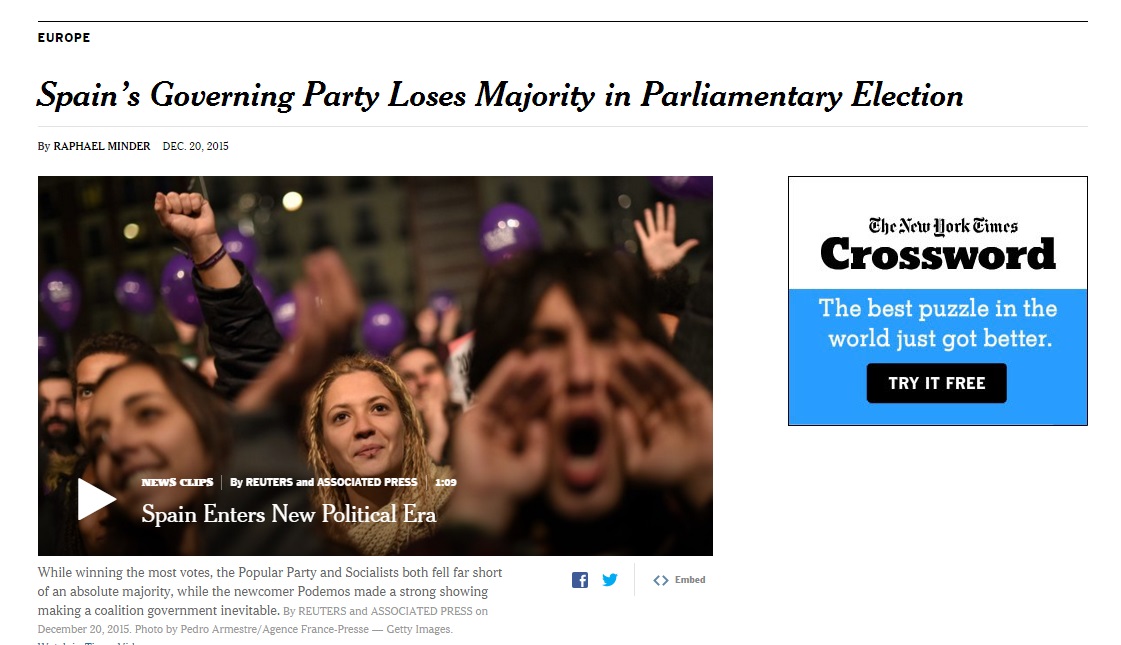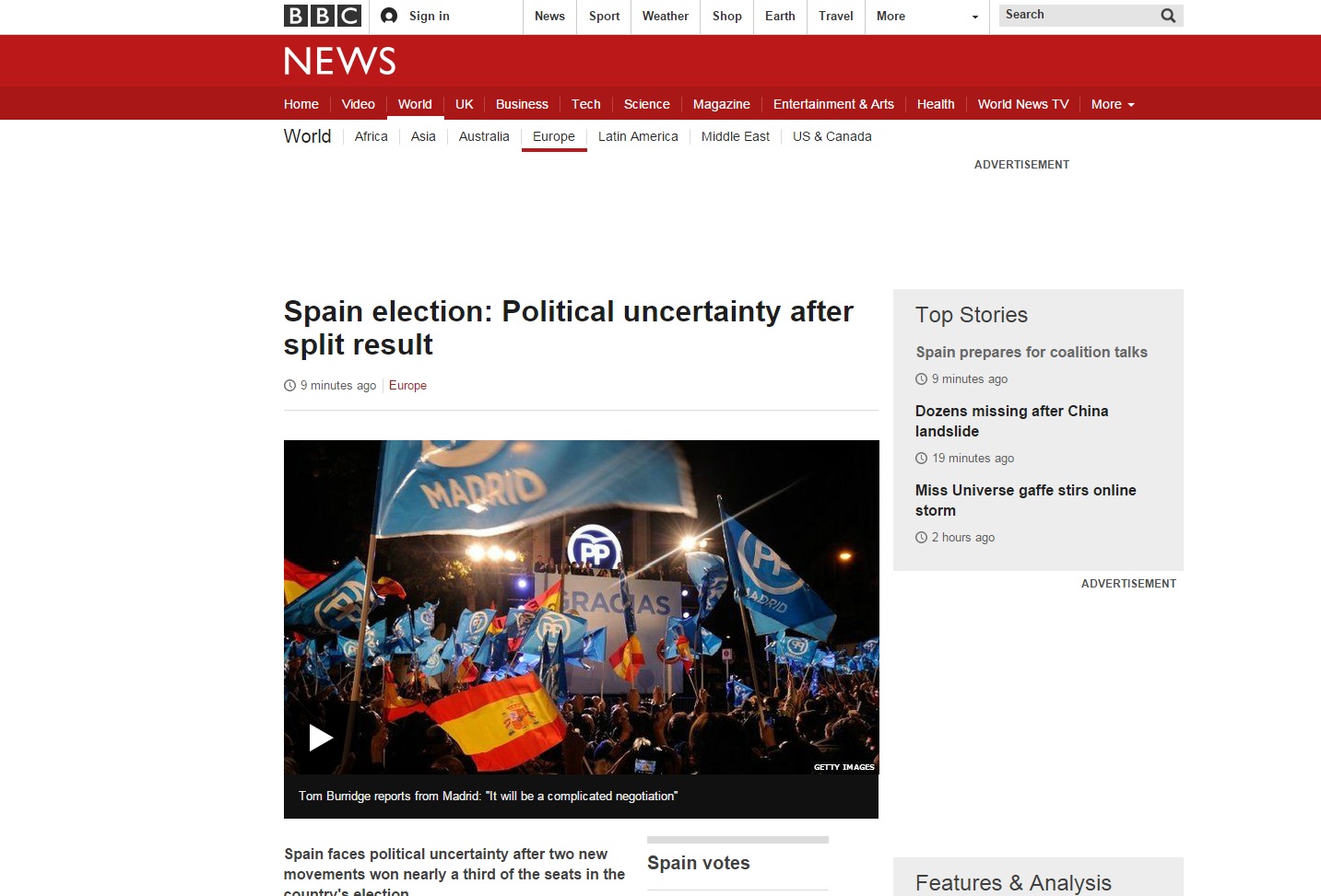 La prensa internacional ha dedicado este domingo por la noche un lugar destacado a las elecciones generales y en todos los casos se expone la misma conclusión: la complejidad del panorama político español que han arrojado los resultados y el auge de los partidos emergentes como Podemos y Ciudadanos.