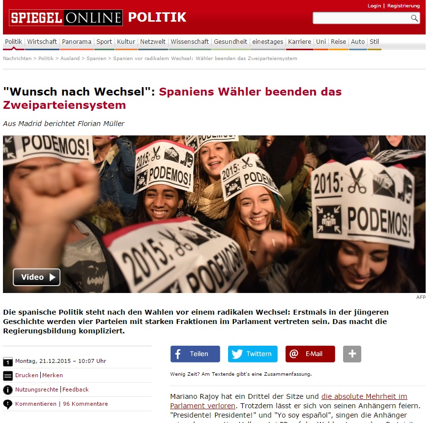 El diario alemán 'Der Spiegel' destaca en su portada digital que el PP ha perdido la mayoría absoluta y que se avecinan "negociaciones complicadas para buscar alianzas" de cara a la formación de Gobierno. En este sentido, ve "poco probable" una gran coalición a la alemana, sobre todo tras el duro debate entre los candidatos de PP y PSOE, Mariano Rajoy y Pedro Sánchez, respectivamente.