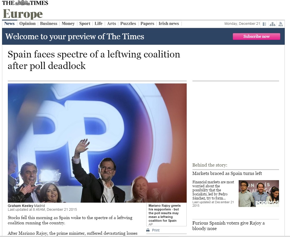 El diario 'The Times' advierte de que "los mercados se preparan ante el giro a la izquierda en España", ya que "se teme que PSOE y Podemos formen alianza", ambos con programas "en contra de las políticas de austeridad".