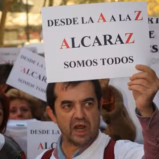 Alcaraz que compareció junto a su abogado Juan Carlos Rodríguez Segura y accedió a las dependencias judiciales mientras sus seguidores coreaban varios lemas como "¡libertad de expresión!". Los simpatizantes esperan ahora en la calle Génova la salida del presidente junto a una fuerte presencia policial.