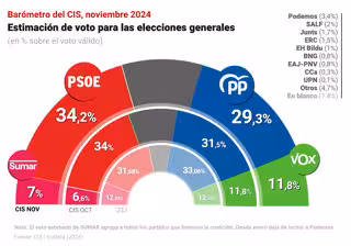 En cuanto al PP, el CIS le otorga una estimación de voto en noviembre del 29,3%, 2,2 puntos menos que el mes anterior y casi cuatro puntos por debajo del resultado con el que ganó las elecciones de 2023.