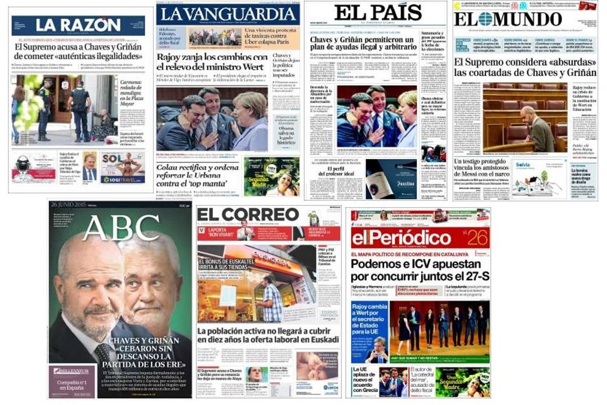 EL MUNDO: "El Supremo considera 'absurdas' las coartadas de Chaves y Griñán"; "Un testigo protegido vincula los amistosos de Messi con el narco"; "Rajoy reduce su crisis de Gobierno a la sustitución de Wert en Educación".
