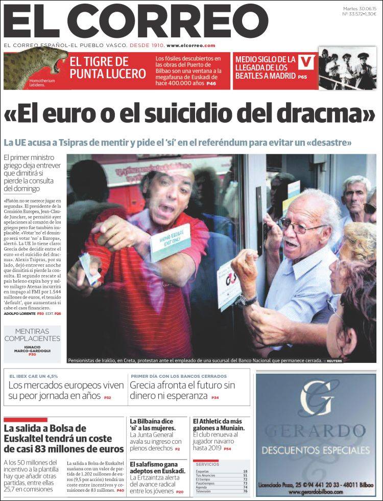 EL CORREO: "El euro o el suicidio del dracma'. La UE acusa a Tsipras de mentir y pide el 'sí' en el referéndum para evitar un 'desastre"; "La salida a Bolsa de Euskaltel tendrá un coste de casi 83 millones de euros".