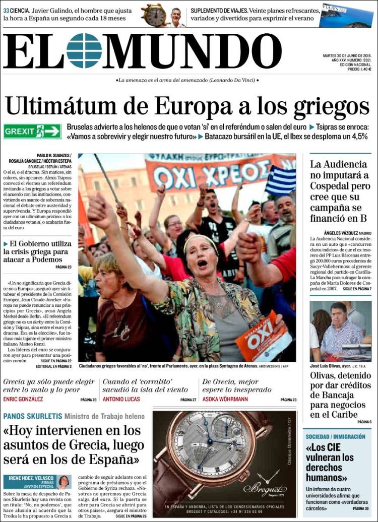 EL MUNDO: "Ultimátum de Europa a los griegos"; "Ministro de Trabajo heleno: 'Hoy intervienen en los asuntos de Grecia, luego será en los de España"; "La Audiencia no imputará a Cospedal pero cree que se financió en B"; "Olivas, detenido por dar créditos de Bancaja para negocios en el Caribe".