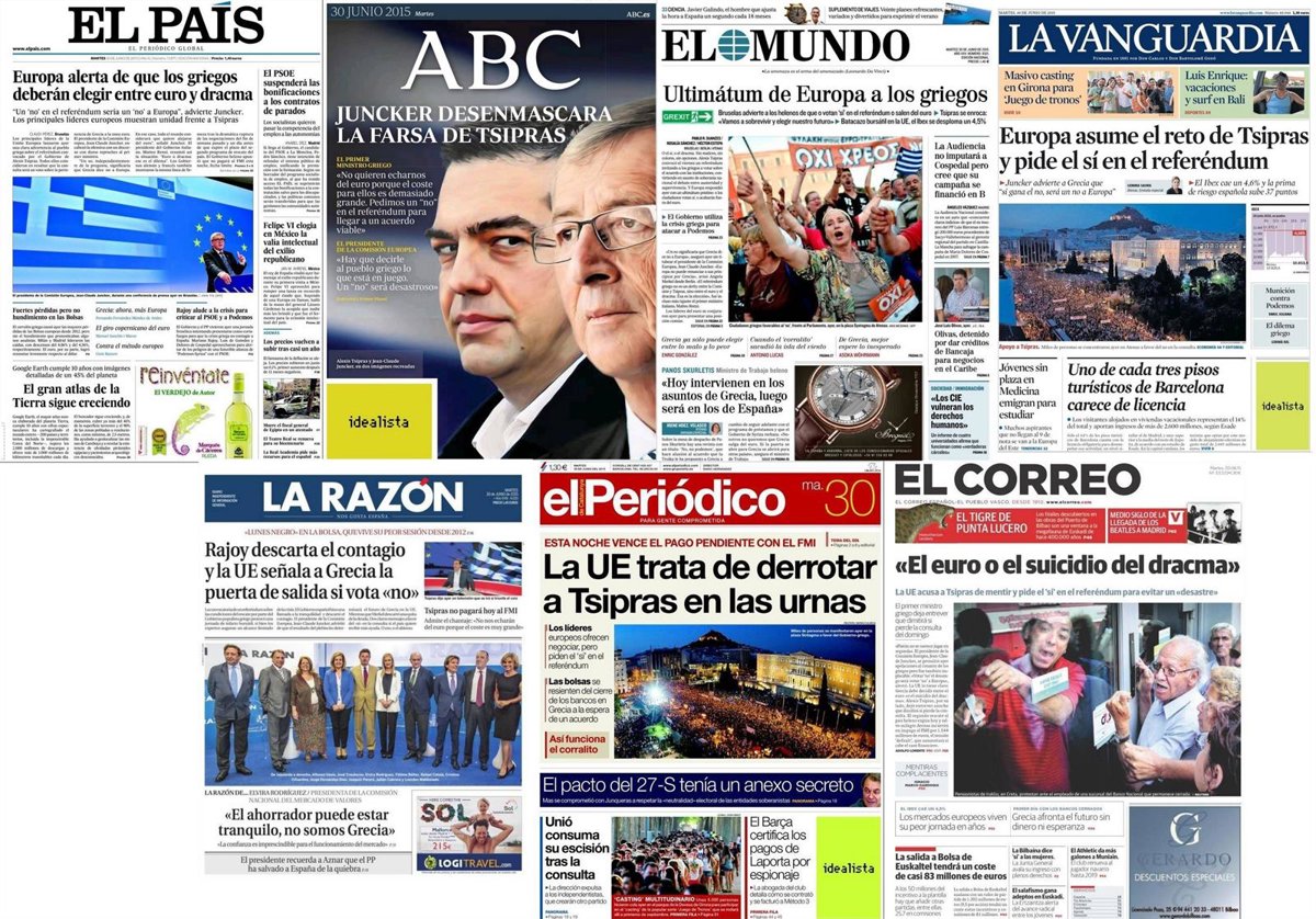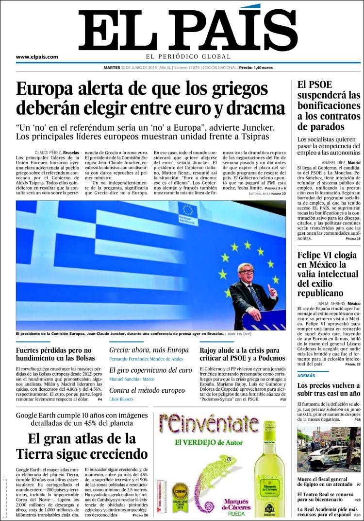 EL PAÍS: "Europa alerta de que los griegos deberán elegir entre euro y dracma"; "El PSOE suspenderá las bonificaciones a los contratos de parados"; "El Rey defiende en México el 'valor estratégico' de la relación con España"; "El gran atlas de la Tierra sigue creciendo. Google Earth cumple 10 años".