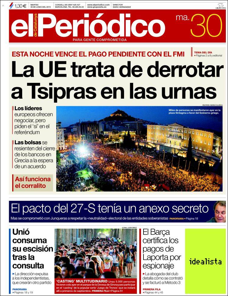 EL PERIÓDICO: "La UE trata de derrotar a Tsipras en las urnas"; "El pacto del 27-S tenía un anexo secreto. Mas se comprometió con Junqueras a respetar la 'neutralidad' electoral de las entidades soberanistas"; "Unió consuma su escisión tras la consulta".