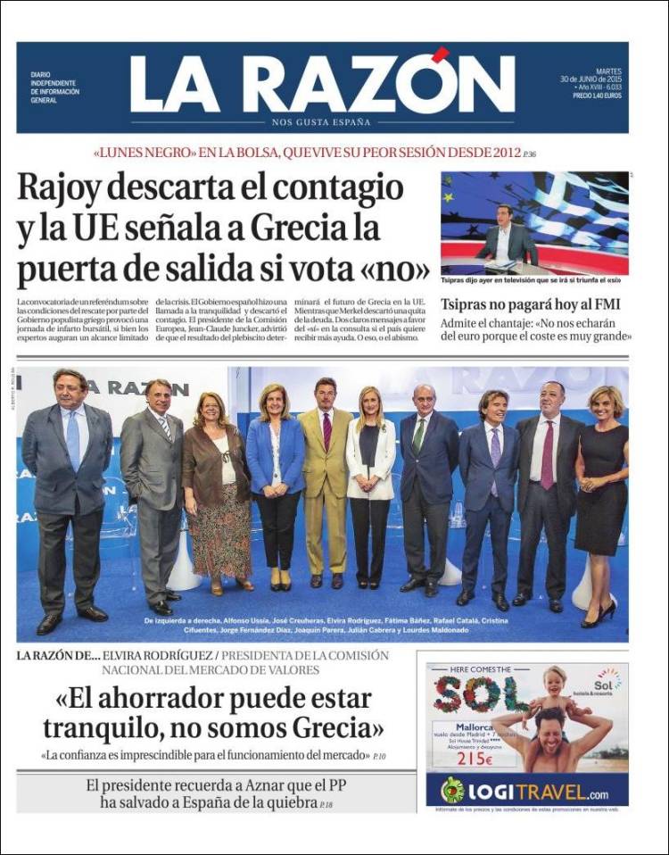LA RAZÓN: "Rajoy descarta el contagio y la UE señala a Grecia la puerta de salida si vota 'no"; "Tsipras no pagará hoy al FMI"; "Elvira Rodríguez: 'El ahorrador puede estar tranquilo, no somos Grecia".