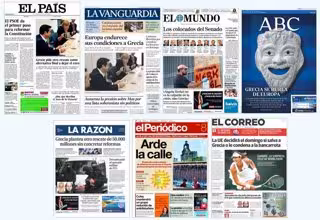 EL MUNDO: "Los colocados del Senado. PP y PSOE se reprochan la 'jubilación' dorada de 9 ex presidentes autonómicos en la Cámara. Alta"; ""Angela Merkel no es la culpable de la crisis, sino Grecia". Entrevista con el escritor Petros Markaris el día en que el Eurogrupo fija un plazo para lograr un acuerdo"; "La ONU pide a España que recupere la asignatura de Ciudadanía"; "Gaditana, 44 años y reclutadora de esclavas sexuales para los yihadistas".