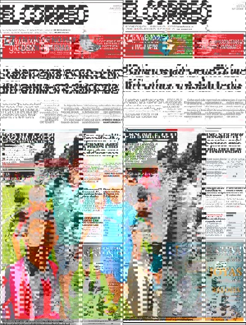 EL CORREO: "El Gobierno español cree que ETA tiene difícil continuar con el sellado de zulos"; "Eraso anima al Athletic. El refuerzo del Leganés impacta con un 'hat-trick' en el estreno goleador del equipo rojiblanco en Sondika (0-14)"; "Tsipras sacrifica el IVA y las pensiones a cambio de más dinero europeo".