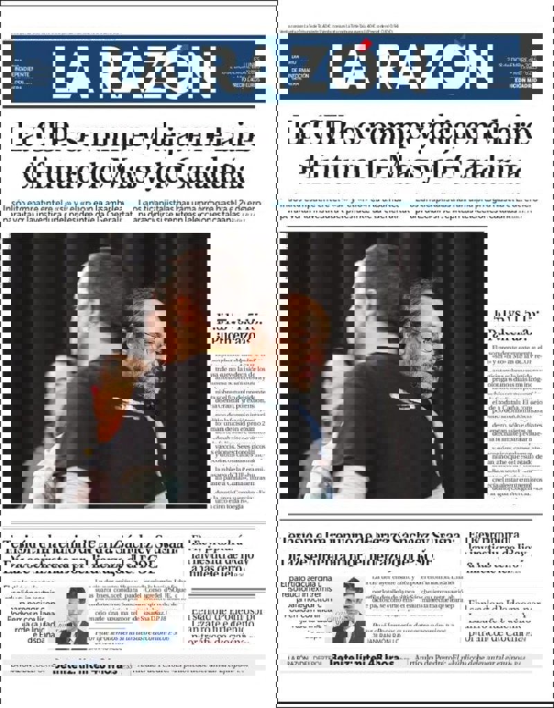 LA RAZÓN: "La CUP se rompe y deja en el aire el futuro de Mas y de Cataluña"; "Tensión en la reunión de Ferraz: Sánchez y Susana Díaz se enfrentan por el liderazgo del PSOE"; "El Rey propondrá la investidura de Rajoy a fi nales de enero"; "El senador de Podemos por Lanzarote fue detenido por tráfi co de cocaína".