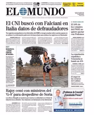 EL MUNDO: "El CNI buscó con Falciani en Italia datos de defraudadores"; "El 59% de los votantes del PSOE no quiere pactar con Podemos"; "Muguruza: Lucho contra mi misma"; "Rajoy cenó con ministros del G-8 para despedirse de Soria"; "La exportación española a Venezuela se hunde un 45%".