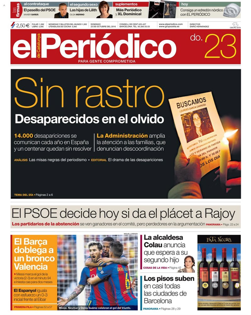 EL PERIÓDICO: "Sin rastro. Desaparecidos en el olvido"; "El PSOE decide hoy si da el plácet a Rajoy"; "La alcaldesa Colau anuncia que espera a su segundo hijo"; "Los pisos suben en casi todas las ciudades de Barcelona"; "El Barça doblega a un bronco Valencia".